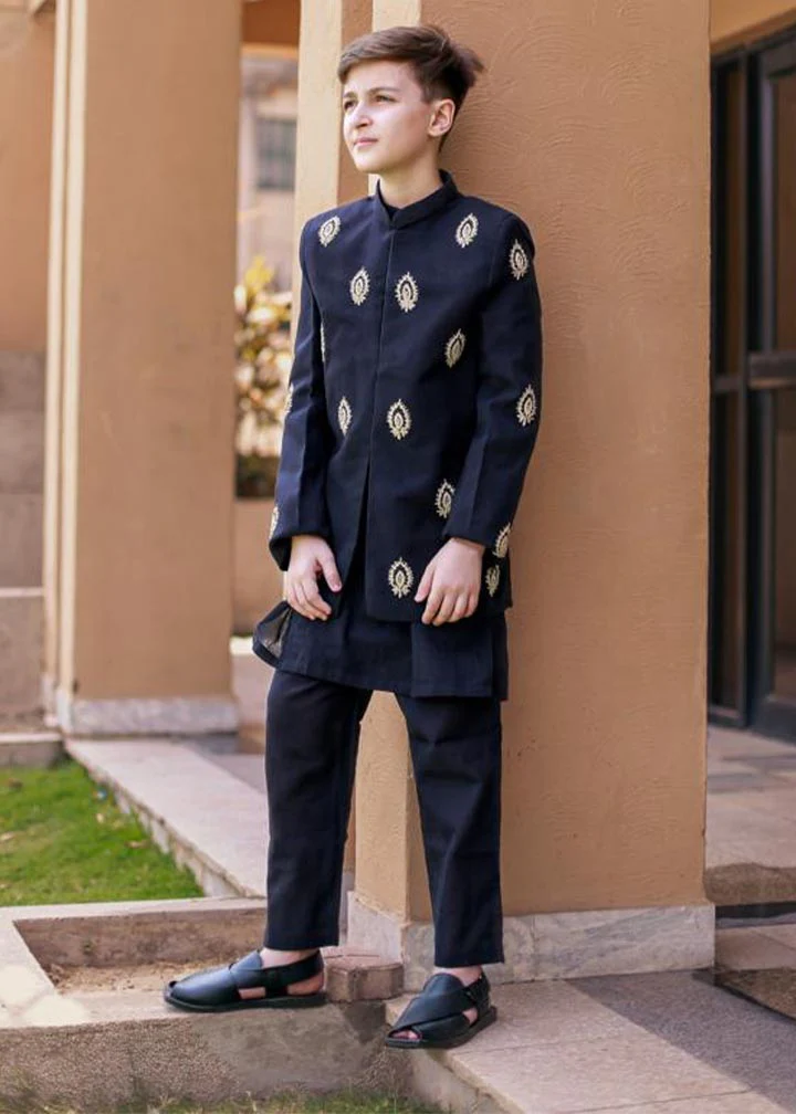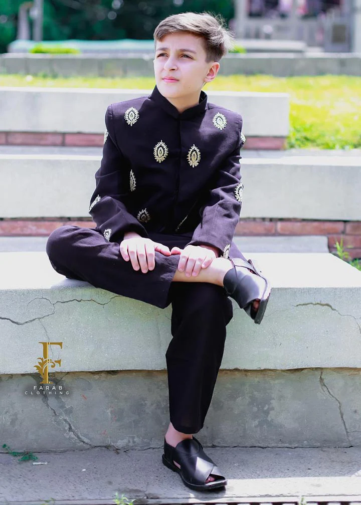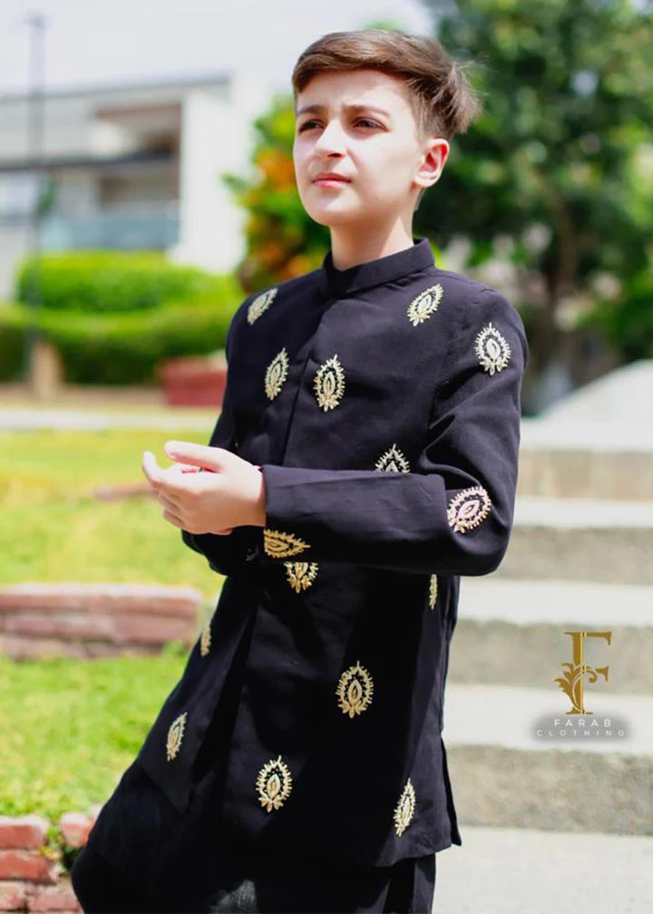This black sherwani is made from luxurious black jamawar fabric, which has a rich and intricate pattern.The design is adorned with elegance showcasing traditional motifs and intricate details.Paired with the right accessories, this black jamawar sherwani is sure to make a lasting impression.