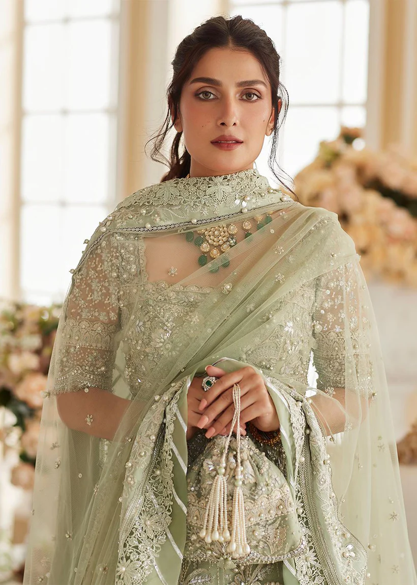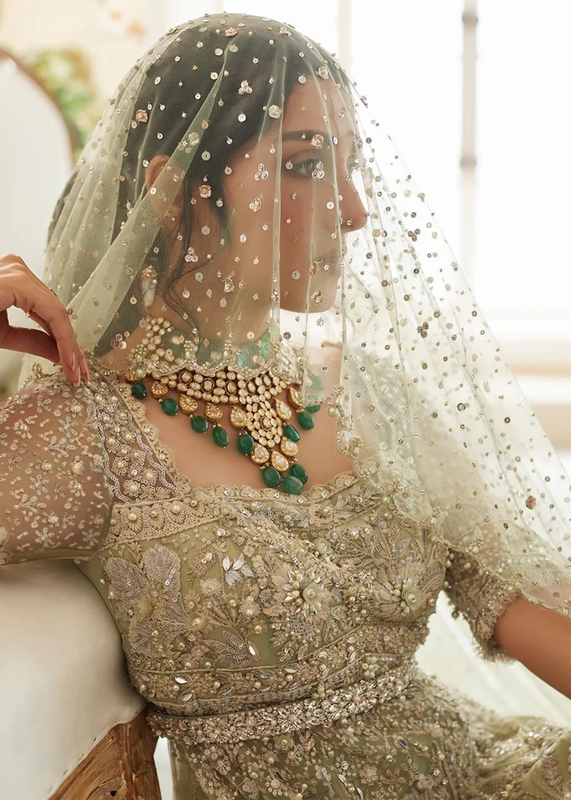 Description: A fascinating fusion of luxurious artworks, Juri is a timeless silhouette richly adorned with scintillating works like zari, sequins and zardozi. The pishwas features decorative arabesques filled with bejewelled dabbi jaal while its bodice is laden with intricate booti of tilla, dabka, sequins and crystals. This open-cut silhouette is impeccably crafted in organza and paired with a fully bedecked dupatta making it a modern heirloom.